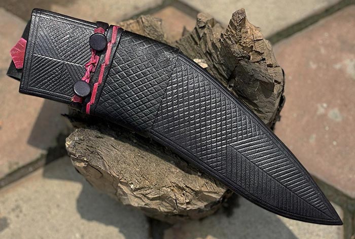 Některá khukuri mají ozdobné pouzdo s nádherně zpracovanými dřevěnými, rohovinovými, stříbrnými, mosaznými a někdy i slonovinovými díly. Khukuri, které jsou speciálně určeny pro účely vystavení, mají vyrobené pouzdro, kde řemeslník věnuje více času a úsilí pomocí rohů, dřeva a jiných drahých dekorativních materiálů vytvářejících krásné vzory a řezby s tradičními a náboženskými symboly v pouzdru.