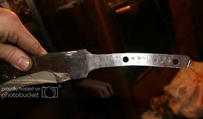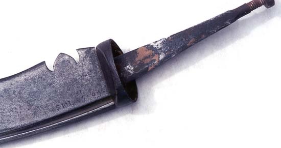 Následně je Tang - trn roznýtován kolem podložky Fulli a držadlo je zafixováno ve své poloze.( Proces je trochu odlišný, pokud jde o rukojeť páky typu Panawala, kde se vrtá na ploché části rukojeti a upevní se dvě rukojeti vyrobené z rohu, dřeva, či kovů.)