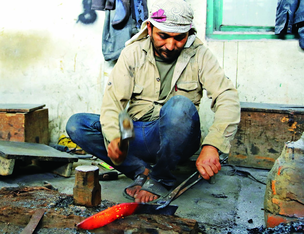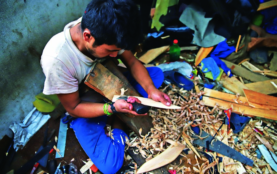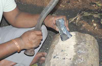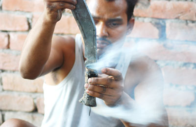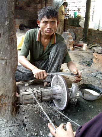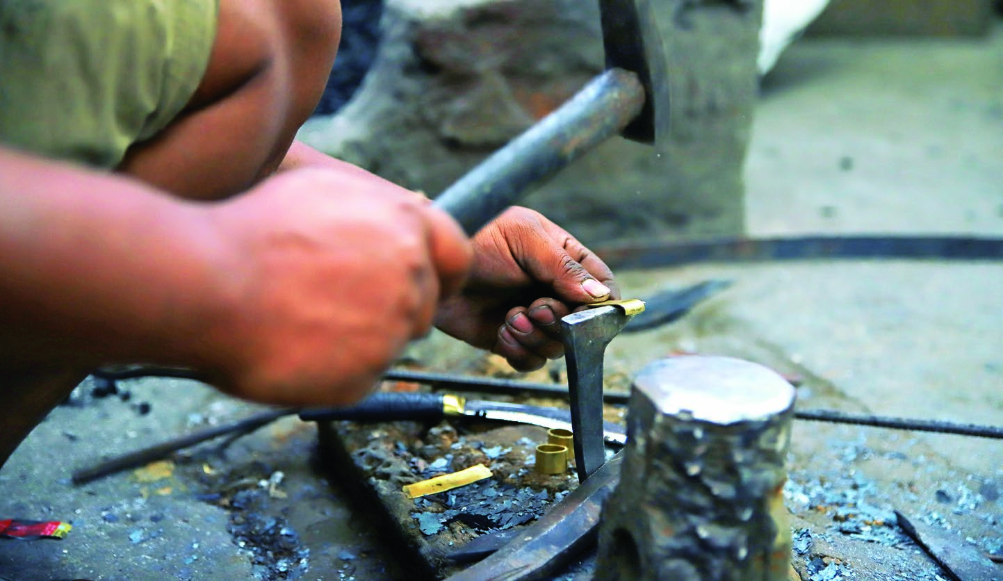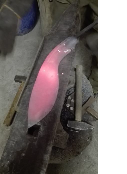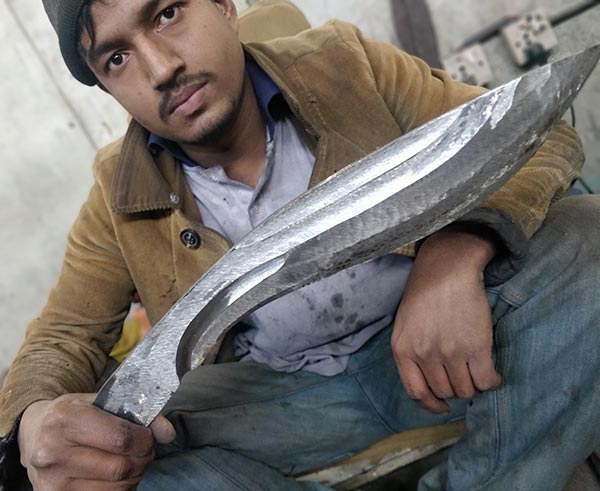 vytváří ostří a hřbet khukuri tak, že v pozdější fázi není nutné žádné